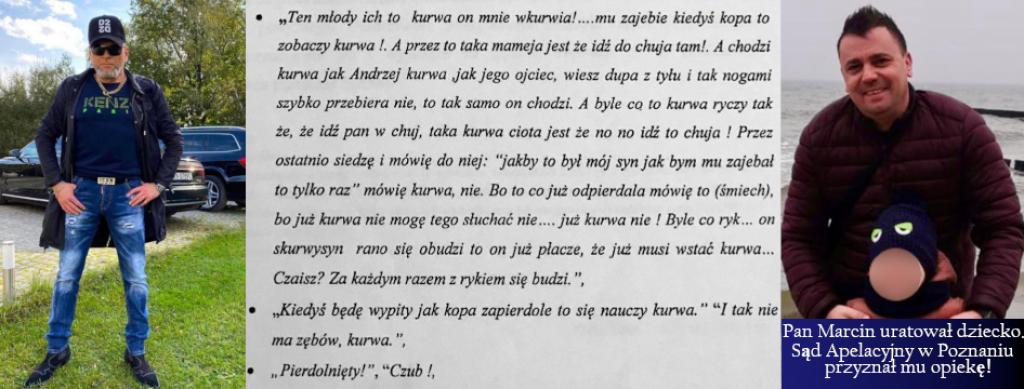 - „Ten młody to tak mnie wkurwia zobaczysz jak mu kiedyś zajebie z kopa w łeb” - Nagranie o takiej treści trafiło zarówno do Sądu Rejonowego w Złotowie który rozpoznawał sprawę rodzinną jak i do Sądu Okręgowego w Pile, który rozpoznawał sprawę rozwodową.