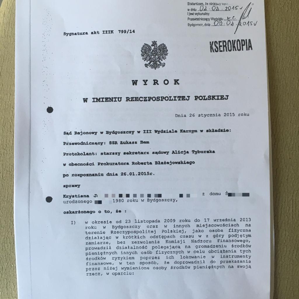 Z prezentowanego wyroku sądowego wynika, że Krystian J. skazany został zaledwie na 27 tysięcy złotych kosztów tzw. naprawienia wyrządzonej szkody. Został też skazany na rok więzienia w zawieszeniu na dwa lata. Najprawdopodobniej Krystian J. doliczył jeszcze pół roku tzw. karencji, która całkowicie zabezpiecza go przed pójściem za kraty.