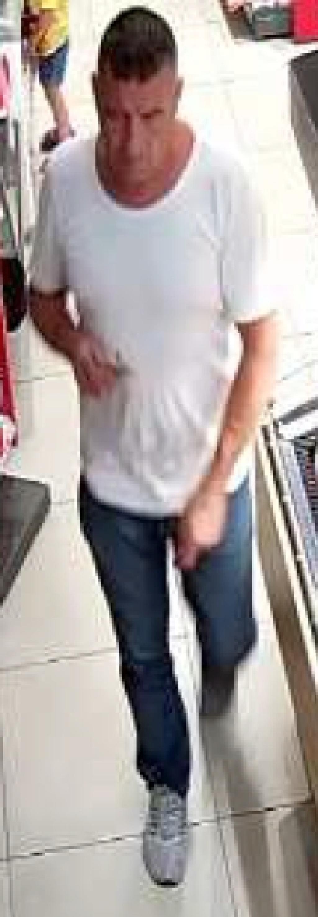 Publikujemy wizerunek sprawcy — mężczyzny w wieku 40 do 55 lat — zarejestrowany przez kamery monitoringu na stacji paliw, licząc na Państwa pomoc w ustaleniu jego tożsamości.