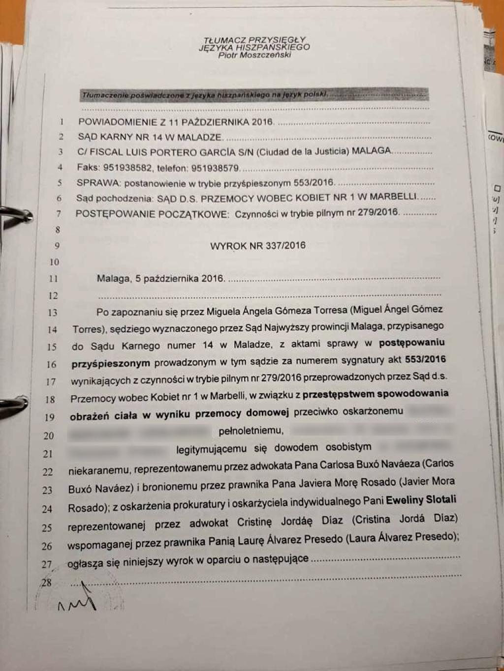 Apogeum agresji nastąpiło podczas wakacji w Hiszpanii. Ewelina Ślotała została ciężko pobita w luksusowej willi w Marbelli niedaleko Malagi. Jej mąż został zatrzymany przez hiszpańską policję i aresztowany na dwa miesiące. (przetłumaczone dokumenty sądowe dołączamy do niniejszego tekstu).