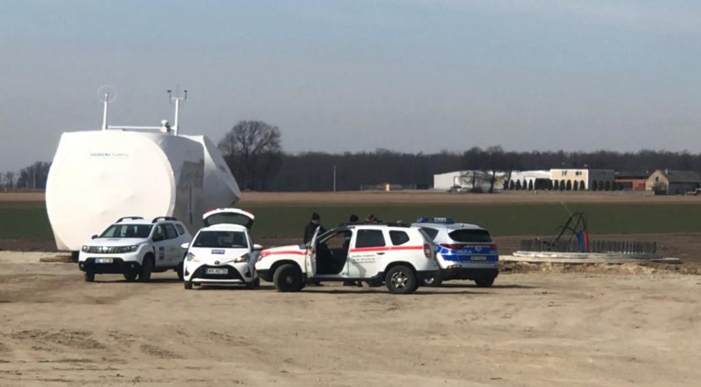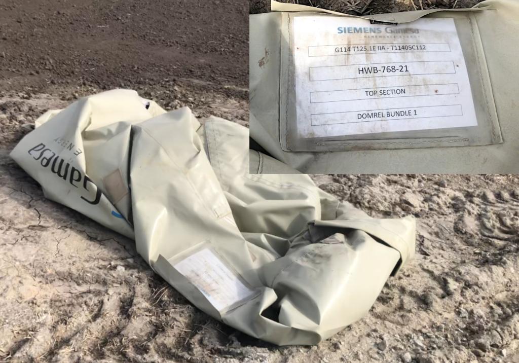 Oczekując na przyjazd radiowozu, odnaleźliśmy opakowanie części bocznej jednego z wiatraków przywiezionego w styczniu 2022 r. Z napisu wynika, że element został dostarczony firmie DOMREL!