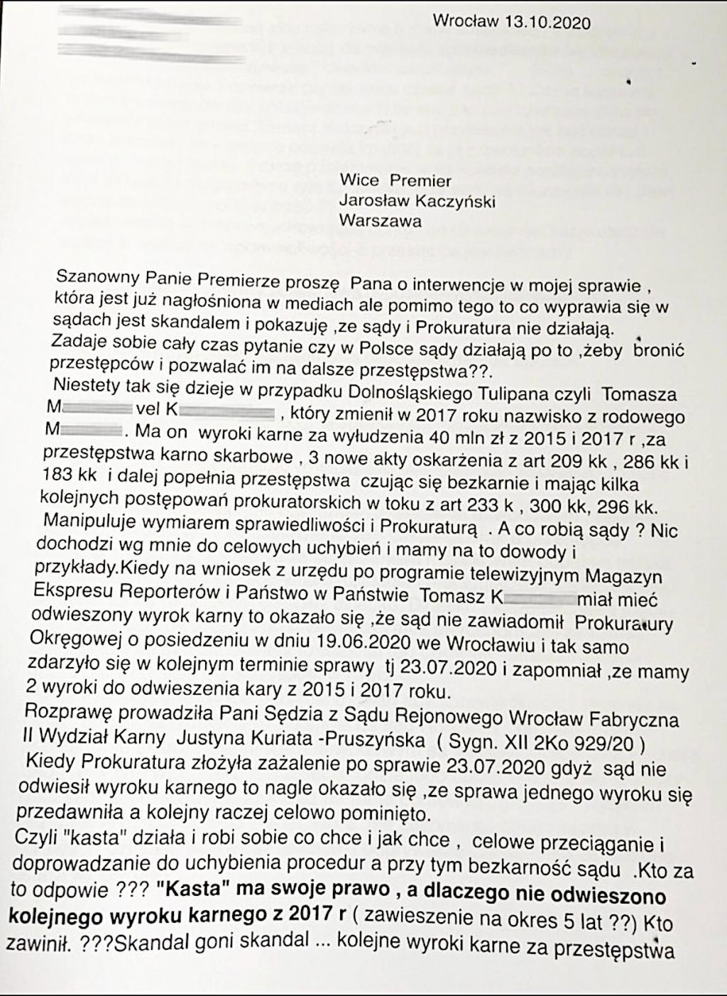 Tomasz K., który przywłaszczył majątek wart 67 mln zł, według dolnośląskich sądów, nie ma pieniędzy, by je zwrócić ofiarom. Nie ma też na alimenty dla niepełnosprawnego dziecka, bo jest ciężko chory. Dlatego nie może iść do więzienia, mimo licznych wyroków. Czy Prezes Sądu Okręgowego we Wrocławiu, Wojciech Łukowski, oraz Prezes Sądu Apelacyjnego we Wrocławiu, Jacek Saramaga, a także Prezes Sądu Rejonowego w Środzie Śląskiej, Beata Michurska-Gruszczyńska, i Prezes Sądu Rejonowego w Dzierżoniowie, Bartosz Szeremet, którzy są za to formalnie odpowiedzialni, podadzą się do dymisji?
