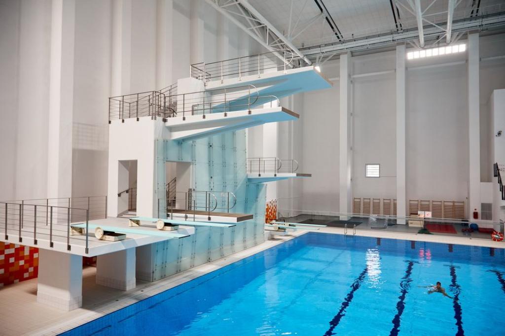 Obok powstał 30-metrowy basen z wielopoziomową wieżą do skoków (najwyższa kładka umieszczona jest na wysokości 10,5 m). Basen do skoków ma 5 m głębokości, ale został wyposażony w ruchome dno, za pomocą którego można wypłycić do dowolnej głębokości część lub całą nieckę.